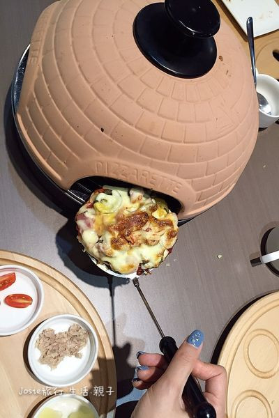來到用餐區,每個座位上都置放一個迷你電窯烤爐,食材區擺放各式pizza配料,拿取想加的配料與半熟pizza餅皮,回到座位加工後再置入電烤爐即可享用。除了pizza還有義大利麵、各式炸物、生菜沙拉...等選項,吃到飽任你選擇。