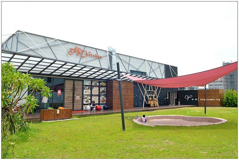 T.R Kitchen位在台中市北屯區,餐廳戶外有大片草地、心型沙坑,來這裡建議帶些泡泡水、球類玩具,吃飽後可以讓小朋友在外跑跳玩耍。