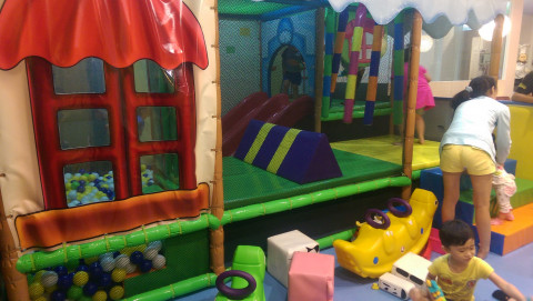 遊戲區限120公分以下小朋友遊玩,入內需著襪,是一組小巧的溜滑梯球池與攀爬設施,一旁還有可愛蹺蹺板、繪本圖書、益智玩具等。