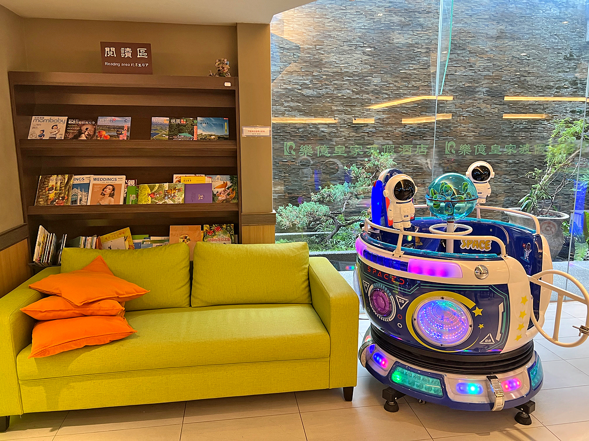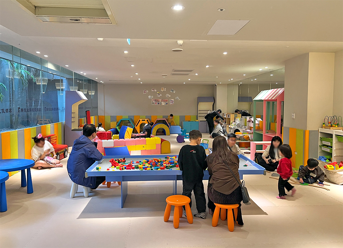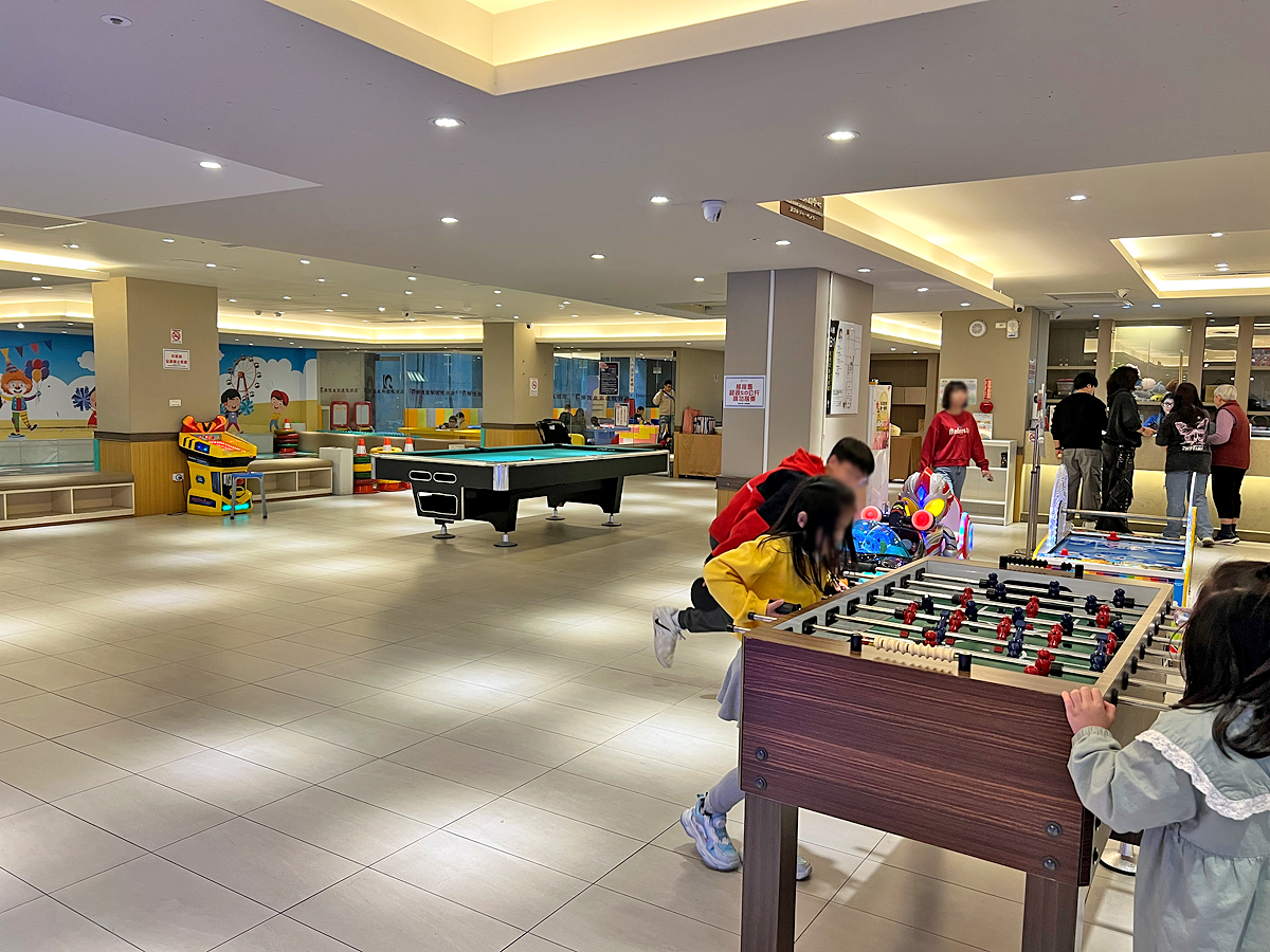 兒童遊戲室位於地下一樓,有積木桌、大積木、感統遊具等,一旁賽車道還有小朋友可以自己開的電動車車;除了遊戲室外,另有書報繪本閱讀區、桌撞球、Switch遊戲機,以及投幣式遊戲機,飯店也有提供腳踏車租借。