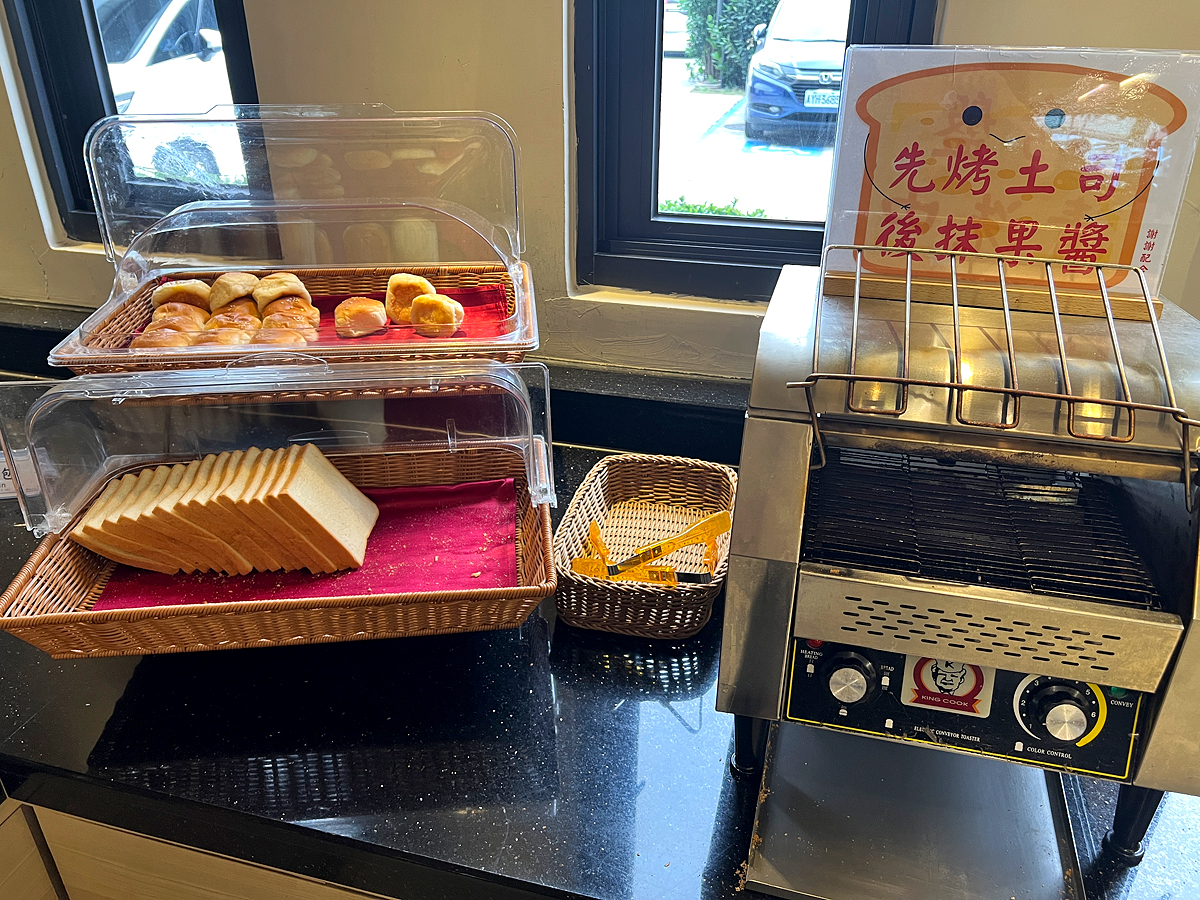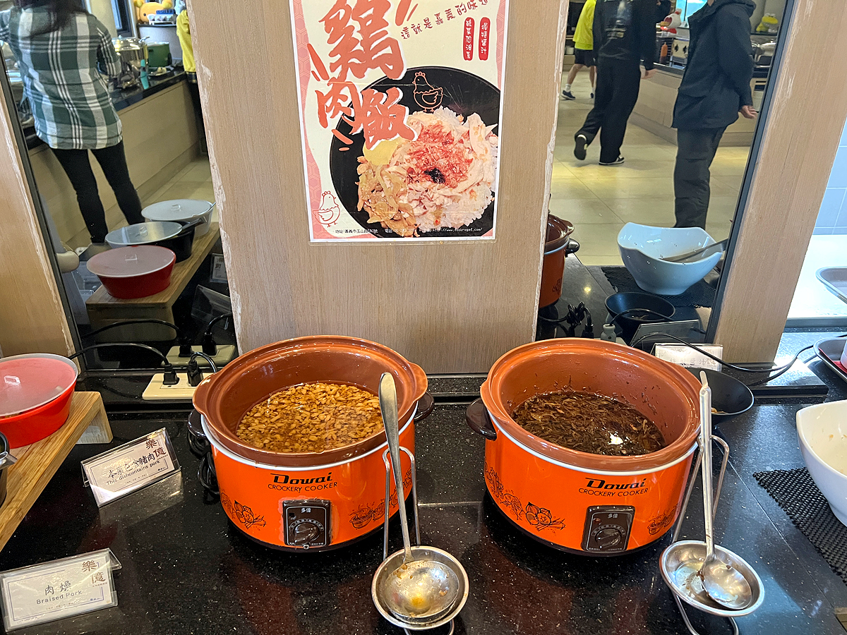 自助式餐點中西式皆有,像是現煎蘿蔔糕、現煮擔仔麵、關東煮、清粥小菜、土司麵包等,也有嘉義特色雞肉飯哦。(早餐內容依當日提供為準)