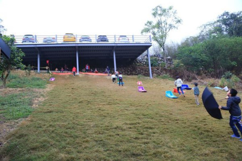 營地規劃了不少親子遊樂設施,有大型山泉水戲水池、沙坑、滑草場,最特別的是營主設計5個彩色水管遊戲屋,裡面各擺放一些童書與玩具,幾乎是小朋友最愛待的秘密基地了。