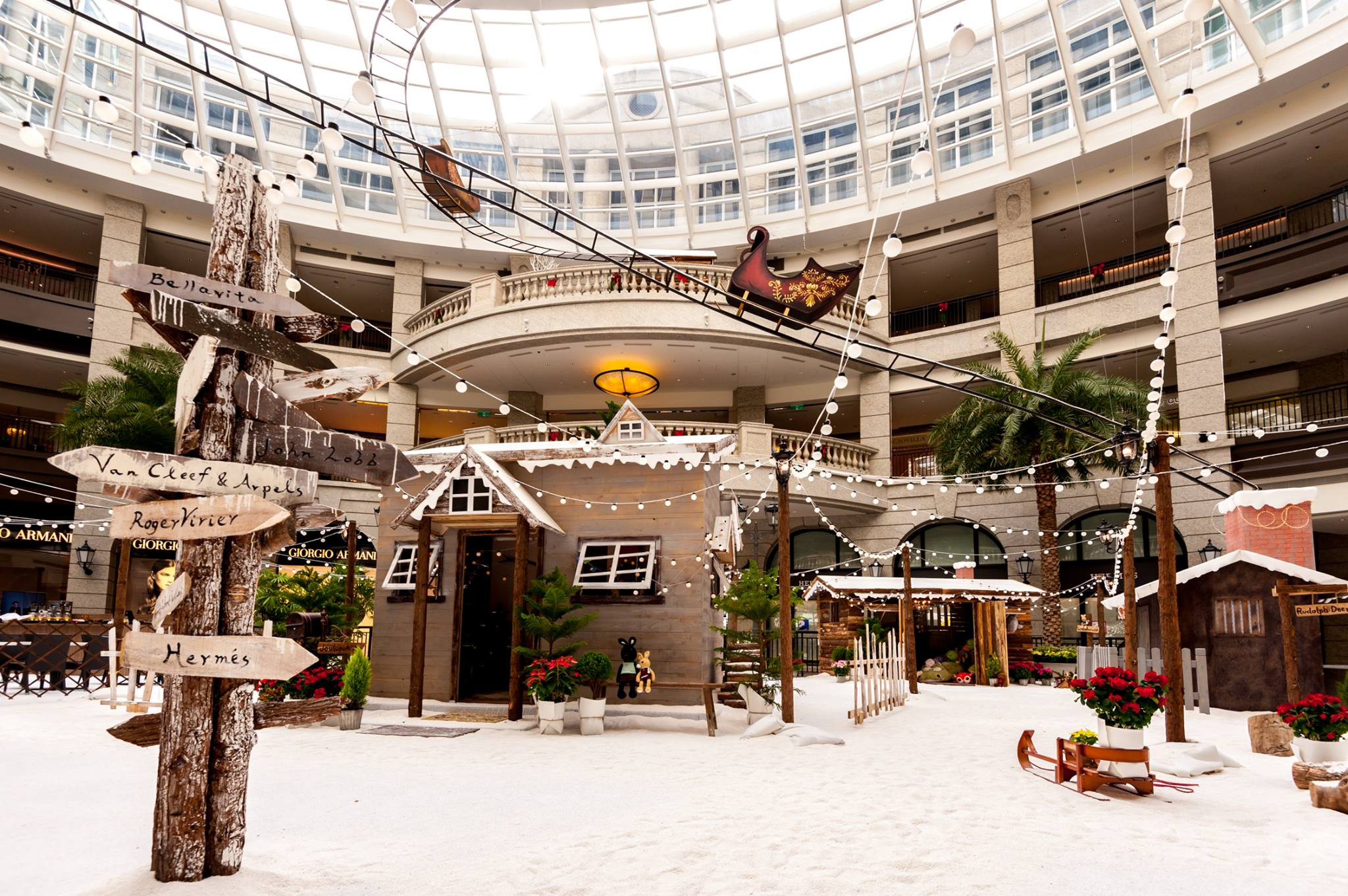 整個中庭充滿聖誕元素,聖誕樹、雪橇、聖誕紅、璀璨燈飾等,空中一座彎沿而下的鐵軌,鐵軌上方有座雪橇,讓人期待聖誕老人現身。
