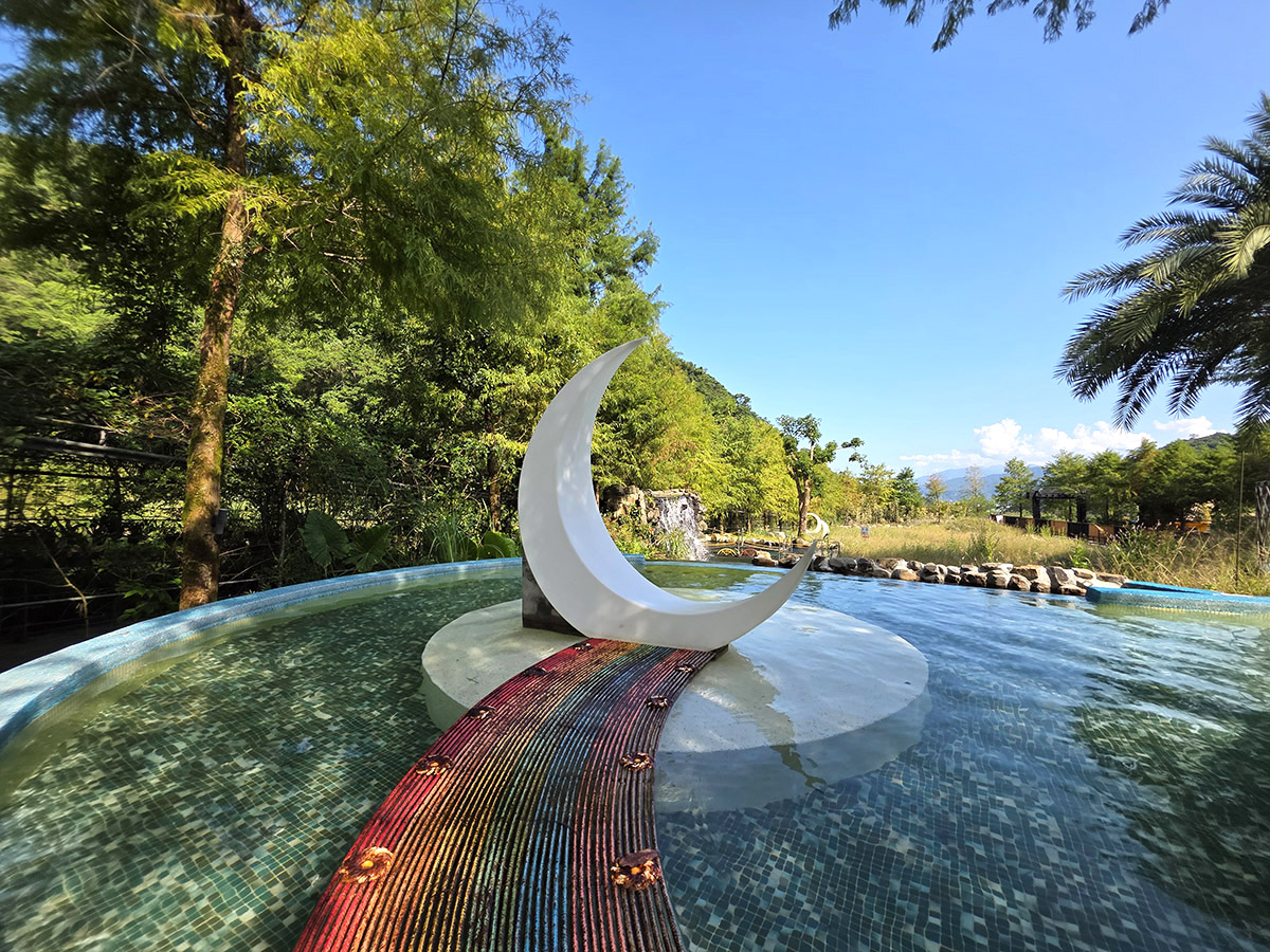 園區內還有多個適合網美拍照的景點,像是漂亮的像彩虹弦月,座落在水上,很適合坐在弦月上拍照,到了晚上還會發光,呈現出各種彩虹色系哦。