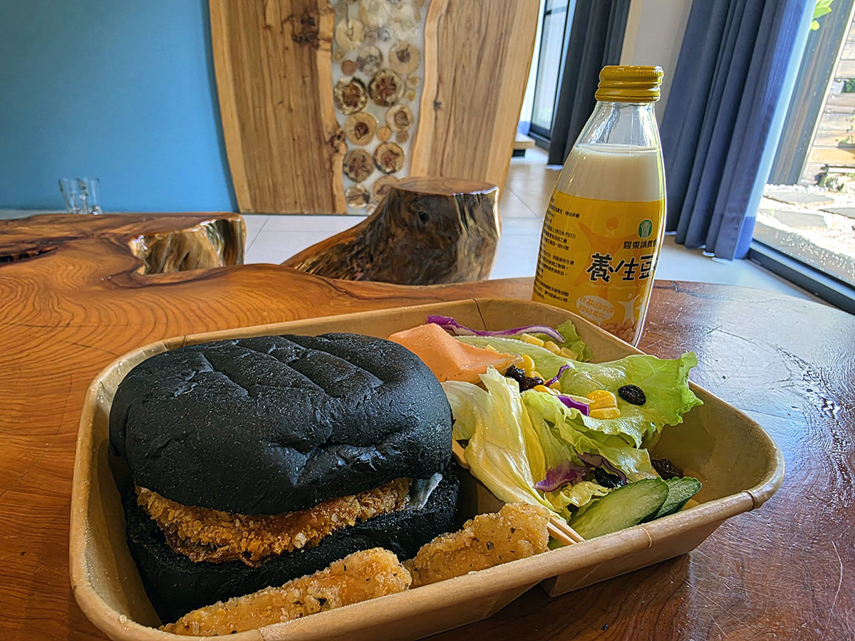 隔天的早餐會有園區專人送到營地房間門口,早餐有漢堡、生菜沙拉及一瓶飲料,預設每房提供2份大人餐點,若有需要可自行加購(大人375元/人、小孩250元/人)。