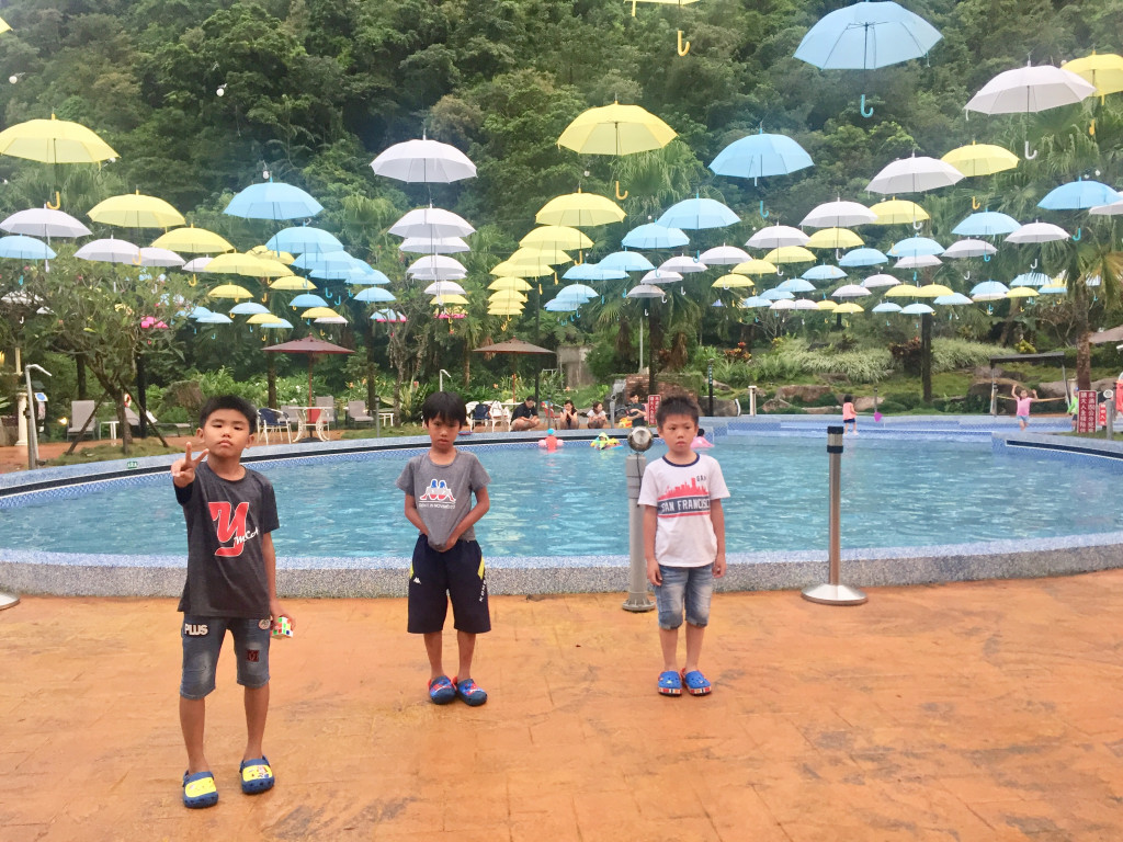 戲水池旁擺放多個南洋風味的遮陽傘與座位,不下水的爸爸媽媽可以坐在這裡照顧小朋友。