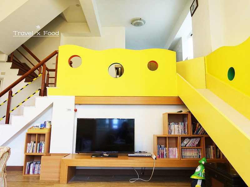 位在花蓮吉安的小王子民宿,是由二棟別墅雙併而成,走入民宿大廳,小朋友們第一個歡呼出聲,因為大廳裡有個亮黃色的造型溜滑梯,旁邊還有個幼兒專屬小溜滑梯,加上可愛布偶、各式書籍與舒適的沙發,讓這裡變成大人小孩都愛待的地方。