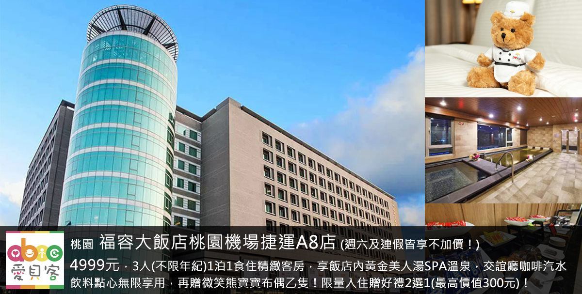 週六連假皆不加價(10/25光復連假還有房),要搶要快!想來北部住宿的家庭看過來,這次愛貝客推出的是福容大飯店-桃園機場捷運A8店4999元享3人(不限年紀)1泊1食入住精緻客房(1雙人床),5799元享4人(不限年紀)1泊1食入住精緻客房(1雙人床+1單人床)!贈A8專屬福容微笑熊寶寶布偶(價值299元/隻,3人專案*1隻,4人專案*2隻,送完為止)及每房贈異國點心籃乙籃!