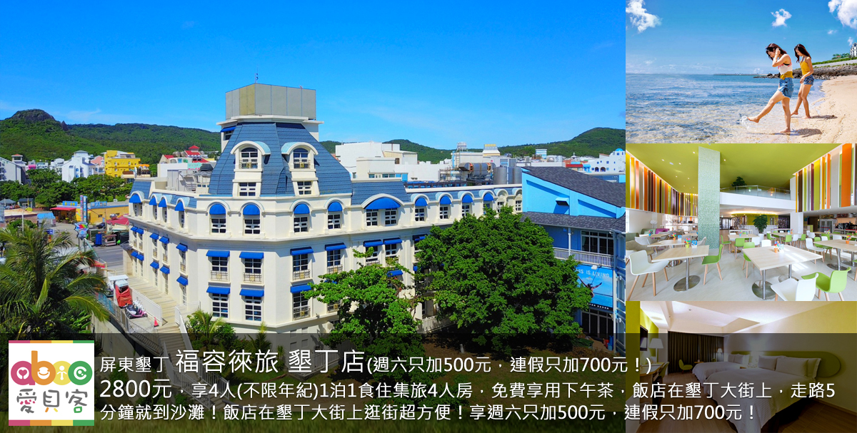 福容徠旅墾丁店-集旅4人房住宿乙晚+享4人(不限年紀)豐富早餐+週六只加500元+大廳免費提供懷舊的小點心與咖啡飲料+步行約5-7分鐘就可以到墾丁海水浴場(可自備玩水挖沙玩具)+免費提供上網服務+免費停車