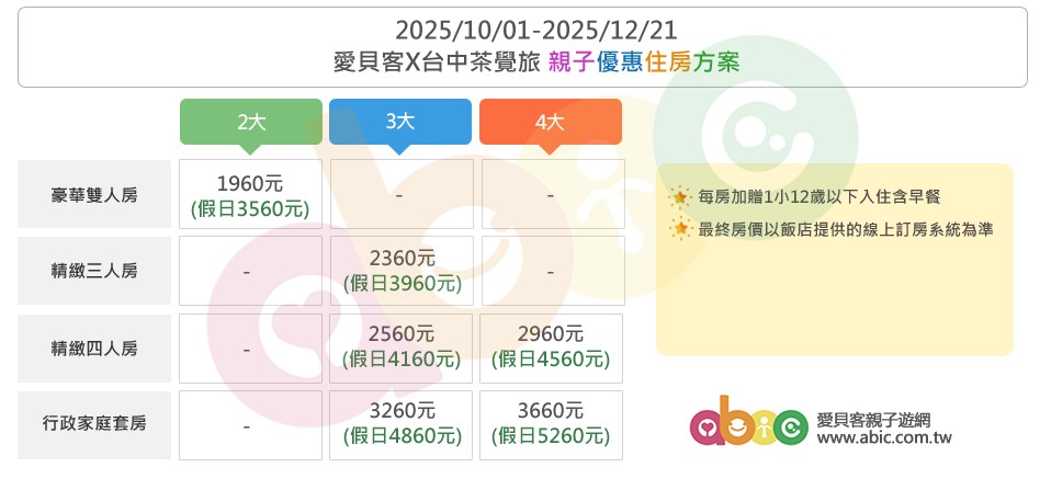 訂房連結:2大住2人房、3大住3人房、3大住4人房、4大住4人房、3大住行政4人房、4大住行政4人房。每房皆加贈1小(12歲以下)兒童入住含早餐(價值500元)!