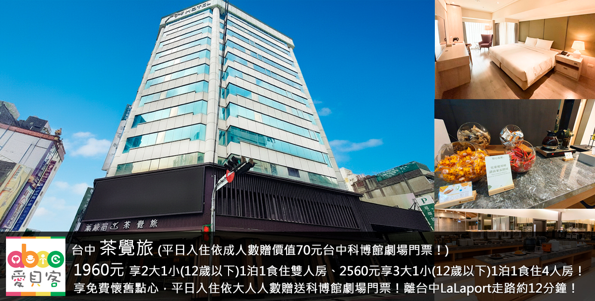 入住茶覺旅乙晚+依房型人數贈早餐+每房加贈1小(12歲以下)兒童入住含早餐(價值500元)+旺日(一般週五)不加價(現省300元)+本專案享週日至週五(排除連假期間)入住,依入住大人人數贈送台中科博館必可飛劇場門票(70元/張),開放時間為週二至週日09:30-16:15(週一休息),加購價60元/張可洽飯店櫃台購買,必可飛劇場播放主題為「蠟筆小新 來自外太空的訪客」+(12/26)為旺日一樣享加增科博館門票+免費零食點心+免費提供上網服務+免費停車