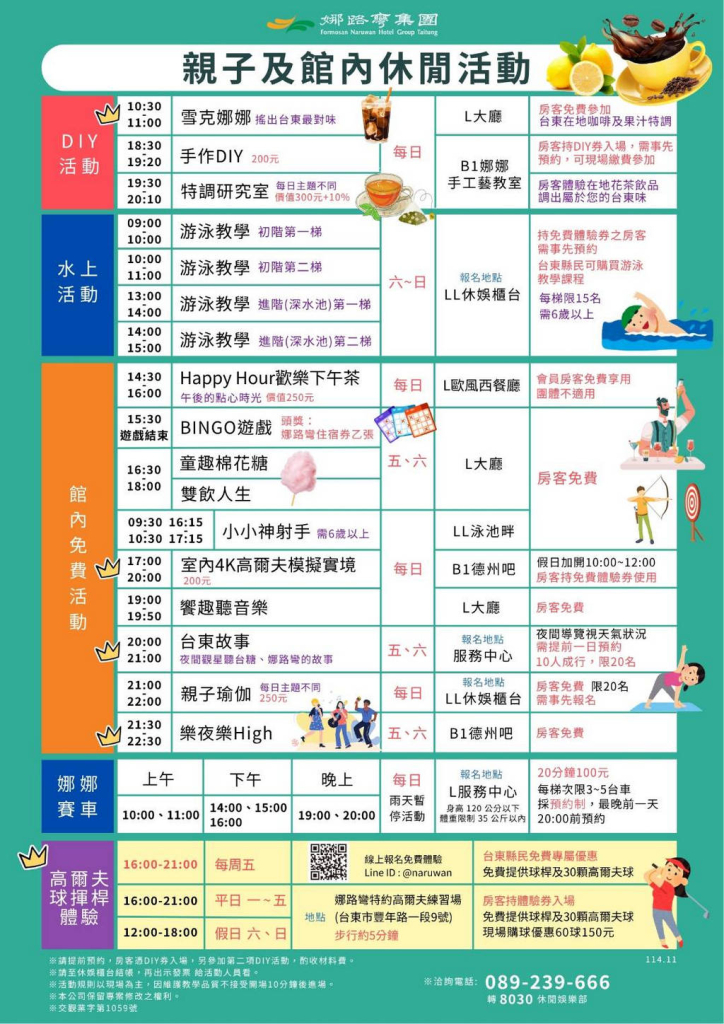 多久沒帶全家人跟小朋友到台東玩了呢?台東娜路彎大酒店就在台東市,離台東火車站車程也只要10分鐘,且飯店有提供台東火車站跟台東航空站定時定點的接駁(每房加收300元,最多4位,第5位以上每位酌收50元),飯店內又有那麼多設施,快趁這次優惠方案,全家來個難得的台東之旅吧!