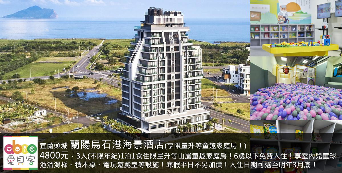 寒假平日不另加價!免費限量升等山嵐童趣家庭房(線上訂房請直接選該房型,現場不額外升等房型)!蘭陽烏石港海景酒店座落宜蘭頭城,飯店緊鄰烏石港,望出去是一片遼闊的海景,且飯店內設有休閒設施。愛貝客這次推出3人(不限年紀)1泊1食住限量升等山嵐童趣家庭房平日只要4800元的超優惠專案!