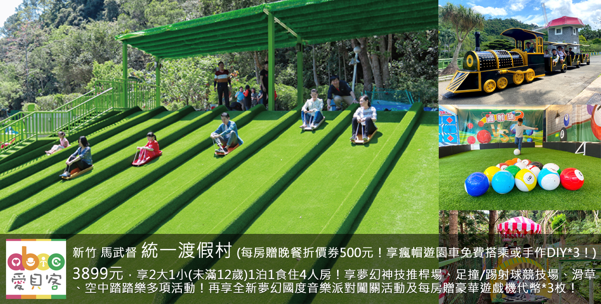 寒假平日不另加價!每房贈晚餐折價券500元!3899元享新竹馬武督統一渡假村2大1小(未滿12歲)1泊1食住4人房,享全新瘋帽遊園車免費搭乘(價值150元/人*3)或手作DIY*3份!享趣味闖關活動、推桿場、足撞踢射球競技場、滑草、空中踏踏樂、遊戲室等!