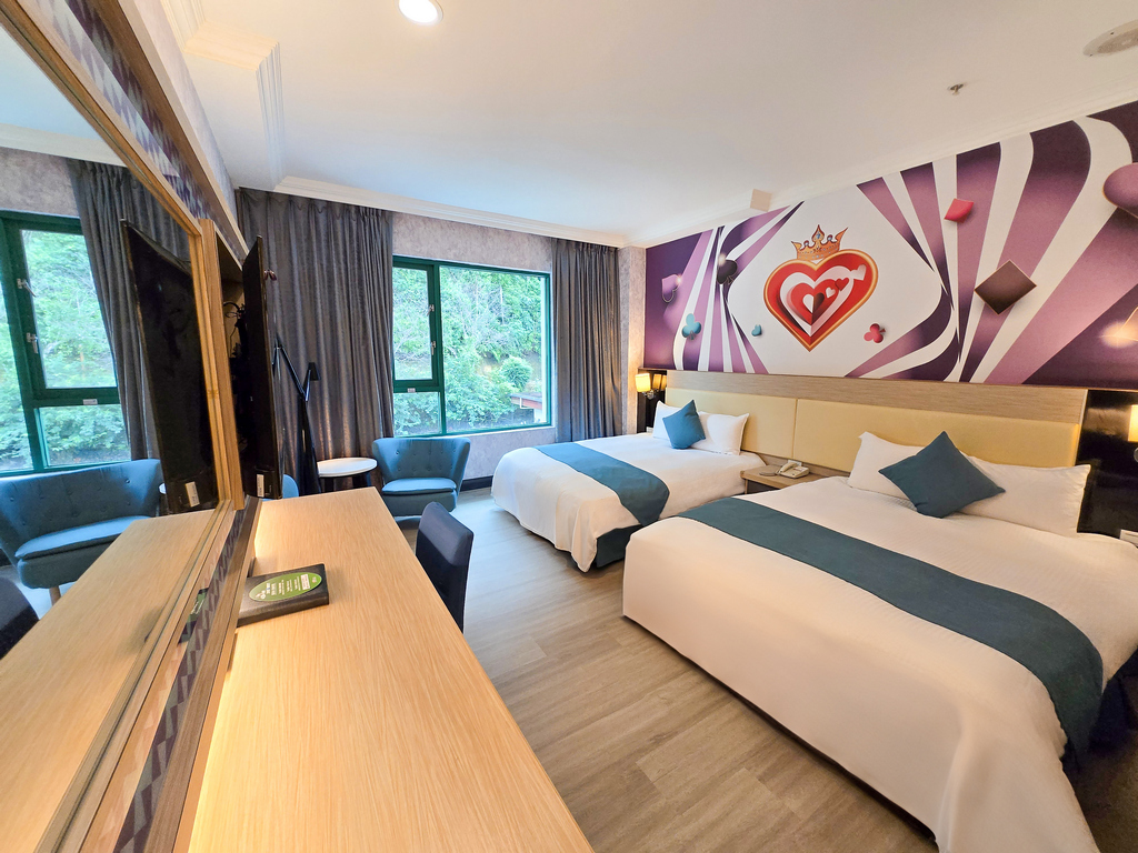 這次專案提供的房型免費升等豪華客房( 2大床),以夢遊仙境為主題, 空間寬敞明亮、綠意環繞、渡假舒適又樂活,房型約8-10坪不等(房型以園區安排為主),提供2張雙人床(床的size為152公分 * 188公分)。(各類主題房型,依現場排房為主)
