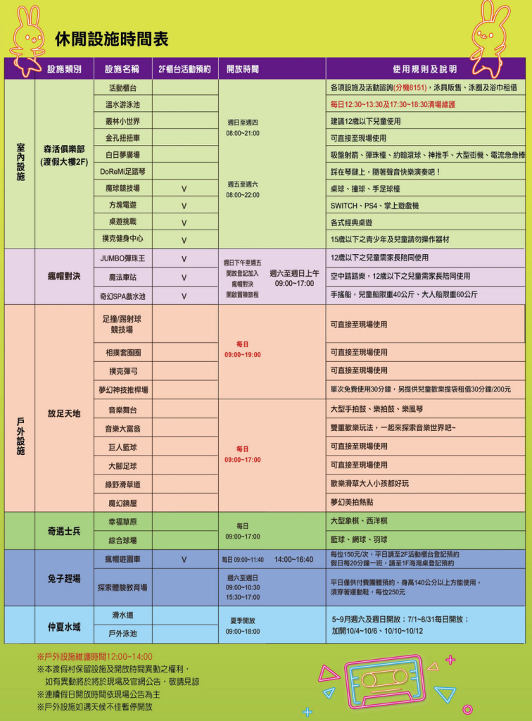 註5 :  園區活動依天氣調整設施開放並且遵守現場規定,活動內容與設施開放時間皆依園區活動提供為主,各項活動內容請至2樓活動櫃檯詢問及預約。