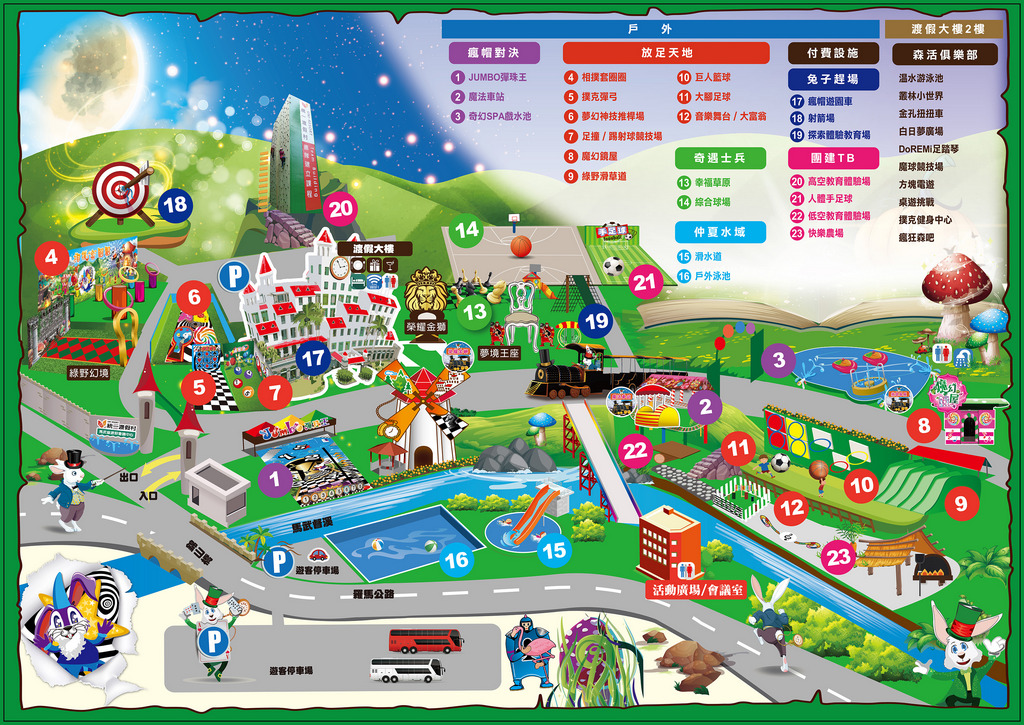 渡假村內就享有全新登場的夢幻神技推桿場、足撞/踢射球競技場、滑草場等大型戶外設施,再送超好玩的探索教育體驗1次(價值350元,只開放週六及週日)、每房贈爆米花乙杯、贈兒童釣魚免費玩乙次(10分鐘/次)!還可參加2025年全新設施活動-夢幻國度音樂派對、魔幻變裝 SHOW、「夜間活動  怪盜S及魔法樂章守護者」(時間:19:30~20:00)!