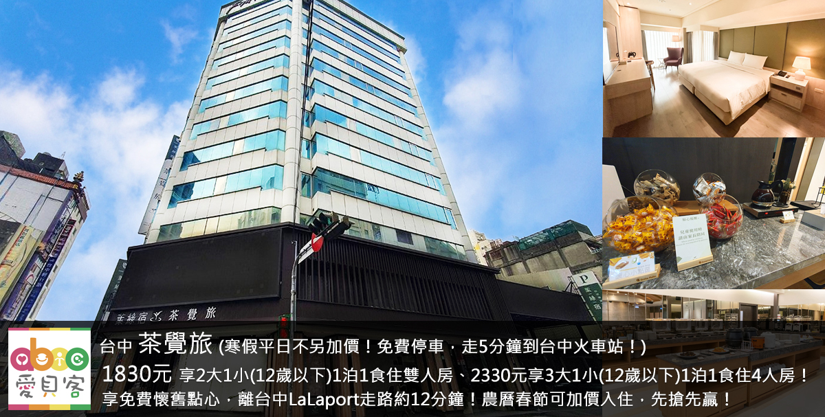 2023年全新裝修!台中市-茶覺旅1830元享2大1小(12歲以下)1泊1食住豪華雙人房、2330元享3大1小(12歲以下)1泊1食住精緻四人房!享免費懷舊點心、享免費停車,走路5分鐘到台中火車站!