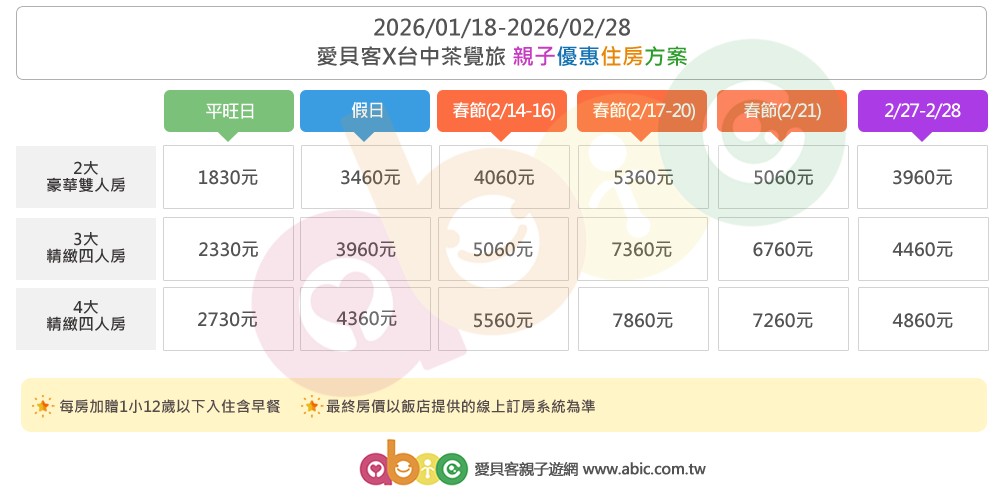 訂房連結:2大住2人房、3大住4人房、4大住4人房。每房皆加贈1小(12歲以下)兒童入住含早餐(價值500元)!