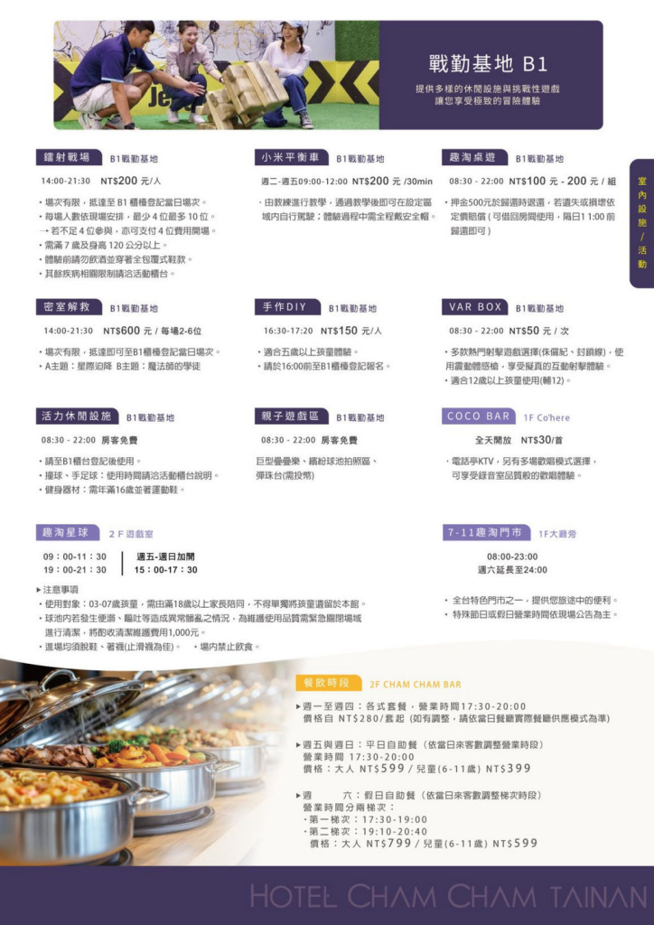 特定週六限量不加價(現省2500元,03/21、03/28、04/18、05/09),先搶先贏!適合家裡有大朋友的家庭!快來試試全台第一家主打冒險體驗的特色飯店!由凱撒集團所推出的台南趣淘漫旅,飯店內超多適合想玩各種新奇有趣活動的家庭,此次推出多項大型冒險設施讓大家免費玩!本專案享3大(不限年紀)1泊1食平日只要3599元,平日入住再加贈1小(未滿12歲)含早餐+6項活動、平日入住每房加贈300元晚餐抵用券乙張,再享飯店泳池與室內溜滑梯球池等設施!每房贈送鐵馬體驗1小時或免費桌遊租借體驗乙次/乙款(2選1),保証讓小朋友玩的開心,大朋友更是捨不得離開!