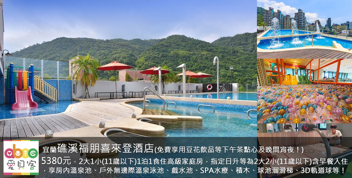 入住宜蘭礁溪福朋喜來登酒店高級家庭房住宿乙晚+2大1小(11歲以下)自助早餐(早餐型式若有異動依飯店現場為主)+享指定日(04/05、04/22、05/04-06/17期間的週一至週四)升等為2大2小(11歲以下)入住,現省1小600元+享加價1619元升等住積木主題房-尊貴家庭房,入住主題房即享亮亮積木禮盒乙組(價值1000元),每日限量,先搶先贏+免費享14:30-16:00 下午點心(鹽滷豆花、點心、紅酒等, 品項請依現場供應為主)+免費21:30-23:00晚間點心(古早味米粉湯、養生素食粥、鹹豆漿等)+迎賓點心+迎賓飲料+每房房內獨立泡湯浴池+Fun樂園(發光積木+積木牆+桌上益智玩具+兒童圖書+無毒溜滑梯球池+牆面益智遊戲+3D軌道運球+懷舊打彈珠機台)+Fun玩彩繪牆+發光積木牆+手足球+桌上冰球+露天無邊際溫泉游泳池+兒童戲水池(水上溜滑梯)+水療SPA+烤箱+健身房+自費自行車租借+免費提供上網服務+免費停車+免費預約礁溪轉運站/火車站定點定時接駁服務(最晚請於入住前一日來電預約,時段請見官網接駁車時刻表)
