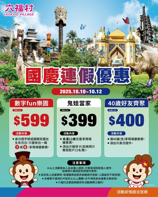 雙十國慶假期要去哪裡呢?10/10-10/12全台各地的大地主題樂園都有優惠活動哦,快來看看。
