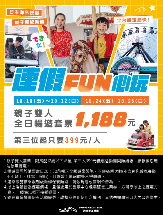 高雄 鈴鹿賽道樂園 10/10-10/12 1大1小12歲以下親子全日暢遊套票1188元,第三位起399元