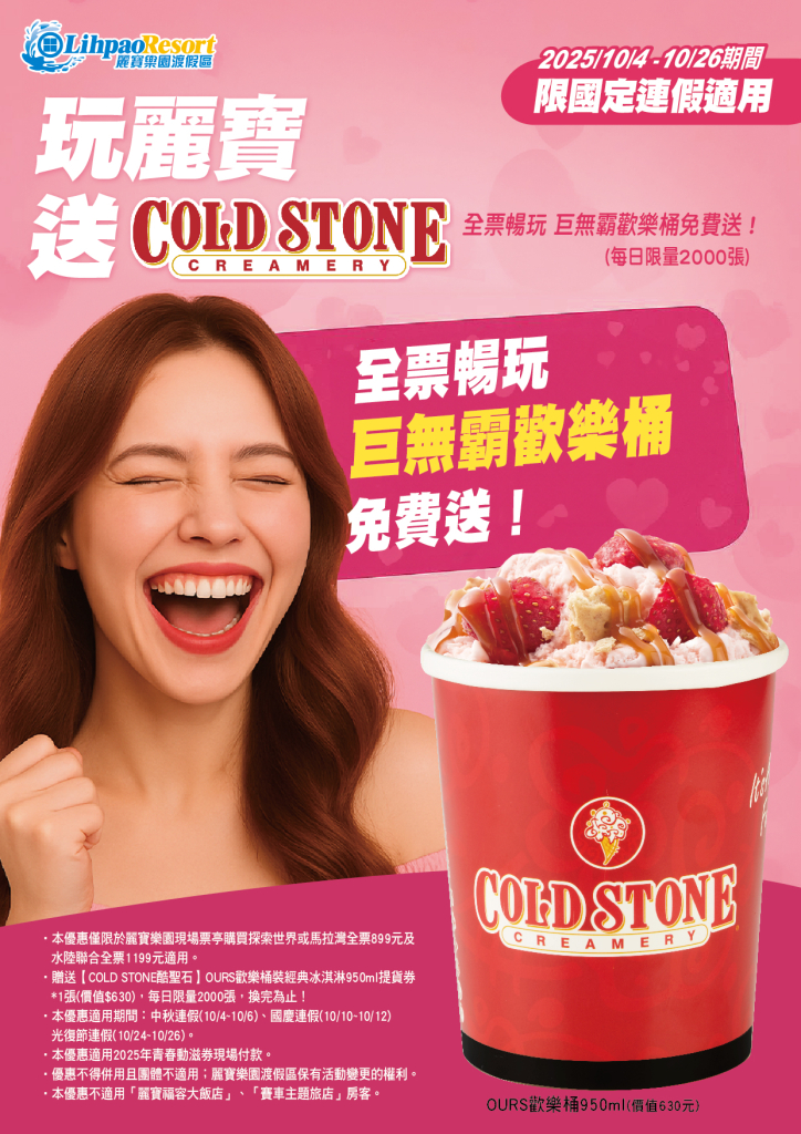 台中 麗寶樂園 10/10-10/12 購買樂園雙園擇一全票899元或水陸聯票全票1199元,贈酷聖石OURS歡樂桶裝經典冰淇淋950ml提貨券*1張(每日限量2000份,送完為止!)