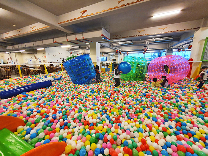 這裡有小朋友最愛的繽紛大球池,球池上有泡泡球、氣墊滑梯與一些充氣玩具。
