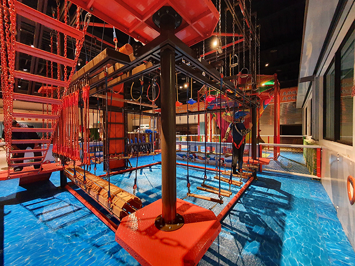 2層樓高的拓展設施就像野外的高低空冒險一樣,設置多種關卡,訓練小朋友的膽量與手眼協調。