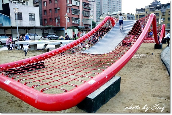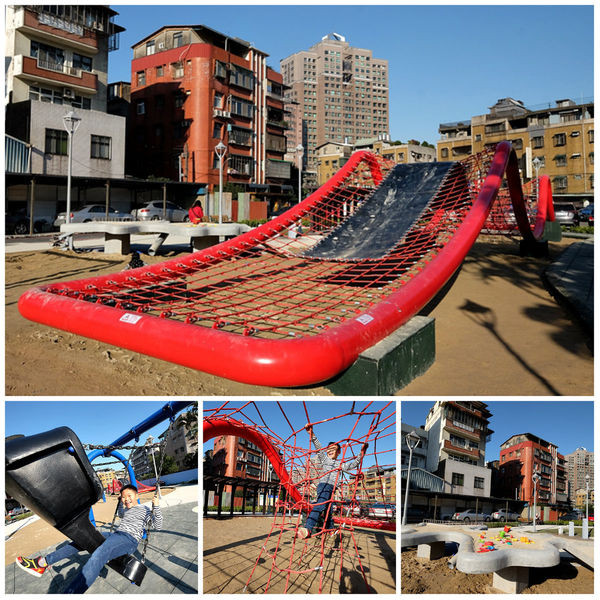 整新後的遊戲場變的更寬敞了,原有的大型攀爬架也回來了,波浪造型攀爬架有著不同高度與斜度,增加挑戰性,一旁還有一座結合溜滑梯的立體攀爬架,滿足小朋友的冒險樂趣,下方細礫石還可以讓小小孩玩沙趣。