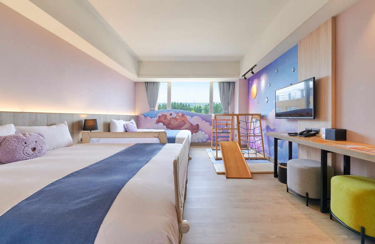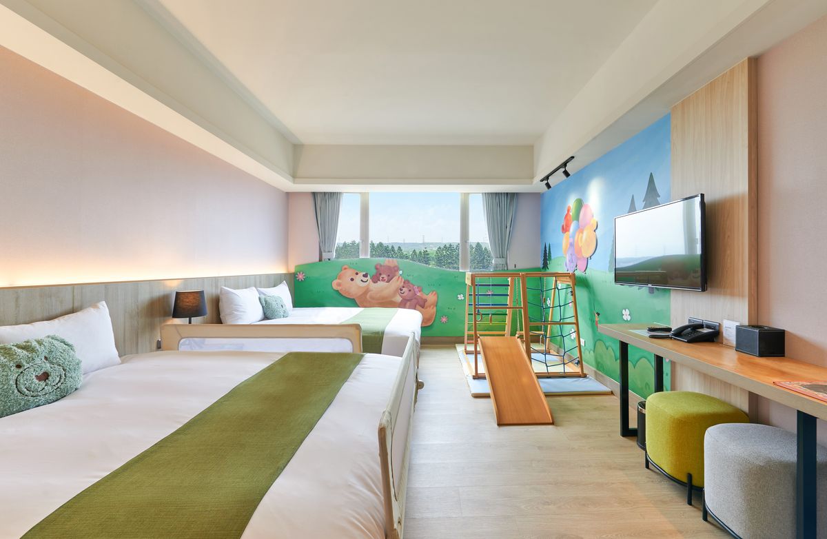 渴望會館2025年再為親子家庭打造溫馨可愛的「小熊主題親子房」,4人房型配置2大床,最棒的是房內有一座AVDAR櫸木攀爬架,集結攀爬與溜滑梯功能,讓小朋友開心玩。