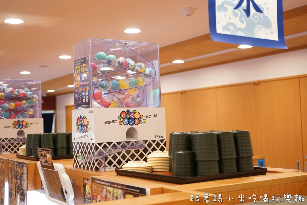 日式餐廳風格,有個人吧台式座位與四人座位,一旁的迴轉道分為上下二層,下層為迴轉壽司,若是透過iPad點餐,點好的餐點會透過上層送餐。每吃完5盤即可參加扭蛋活動,只要抽中,小禮物就會由上方的扭蛋機掉下來。