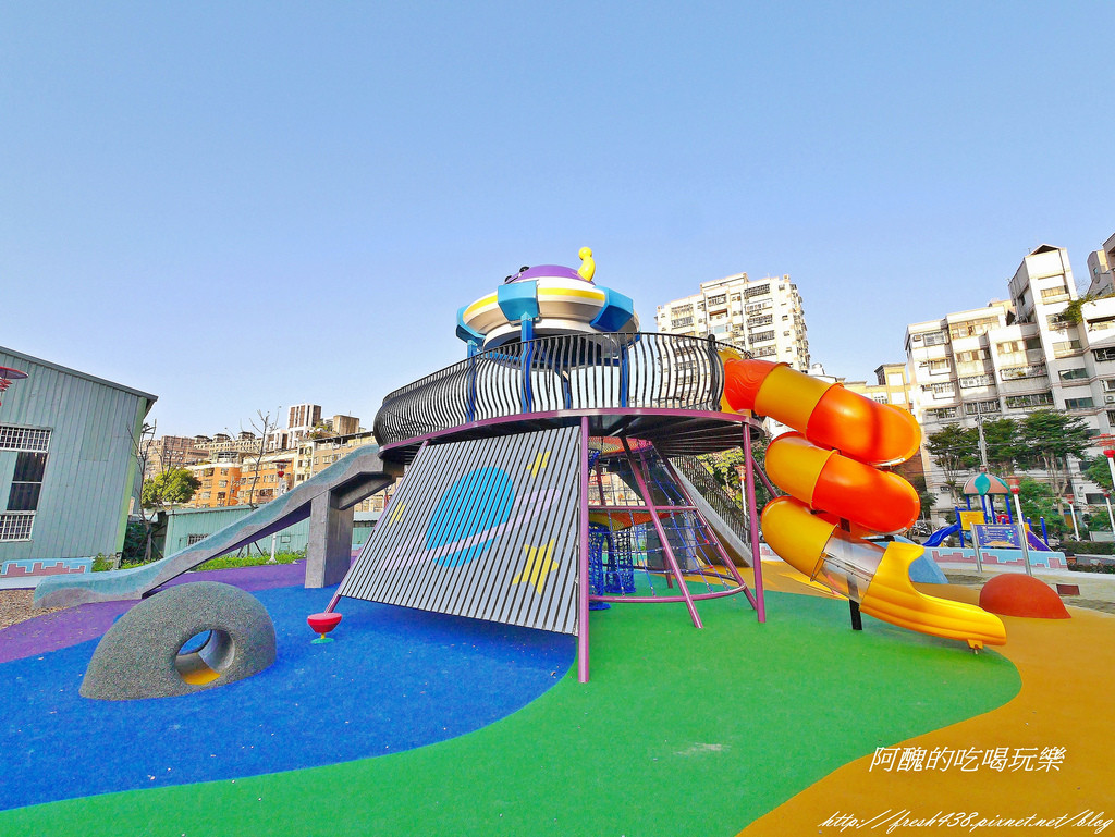 再往內走就是最吸睛的飛碟溜滑梯遊具!大型溜滑梯遊具約二層樓高,有一個旋轉溜滑梯與磨石子溜滑梯。