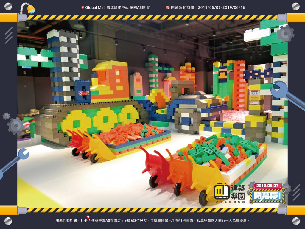 KID'S建築樂園第二間長期館於2019/06/07在桃園環球購物中心A8館B1正式開幕,以韓國大型積木打造的室內遊樂園,多樣遊樂設施要讓小朋友玩不停。
