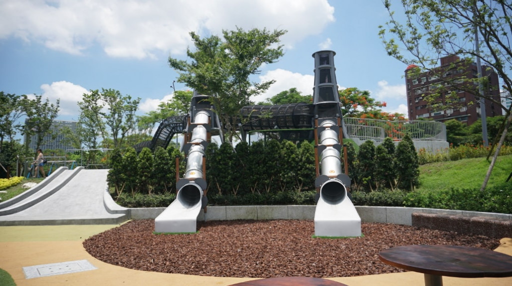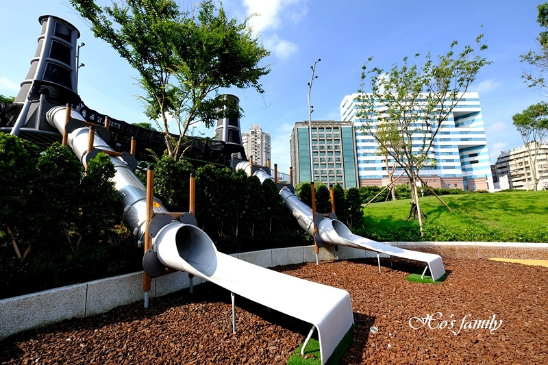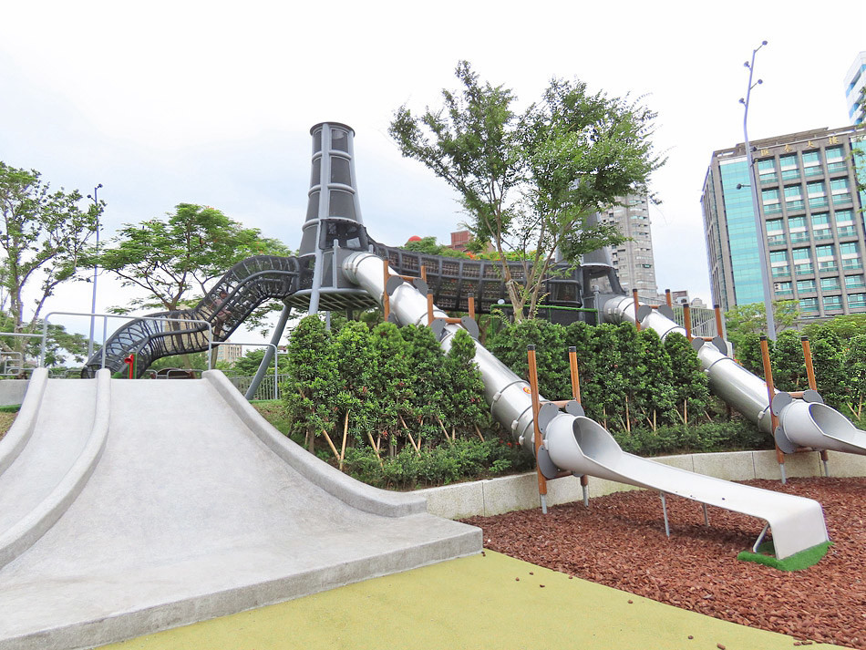 公園內分為7座主題遊戲區,其中最具特色就屬結合攀爬與溜滑梯的煙囪遊戲塔,鑽進隧道攀爬網往上爬,再由金屬水管滑梯快速滑下好刺激,一旁則有寬、窄滑道磨石子溜滑梯可以玩。