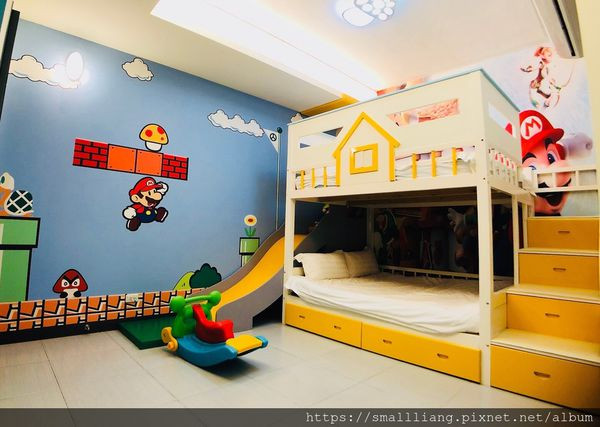 溜滑梯房型分別是遊赤崁、瑪莉歐與彩色鯨魚,房內也有布偶、搖搖馬、紅白機、廚房組與球池等玩具。(房內玩具依主題而不同)