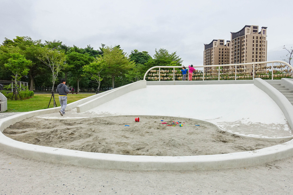 寬面磨石子滑梯玩法不受限較多元,爸媽也可以跟著小朋友一起溜,二側另有窄滑道的滑梯可玩。滑梯下方是大片戲沙坑,愛玩沙的小朋友可以玩上一陣子,記得帶上挖沙工具前來更好玩。