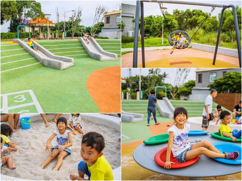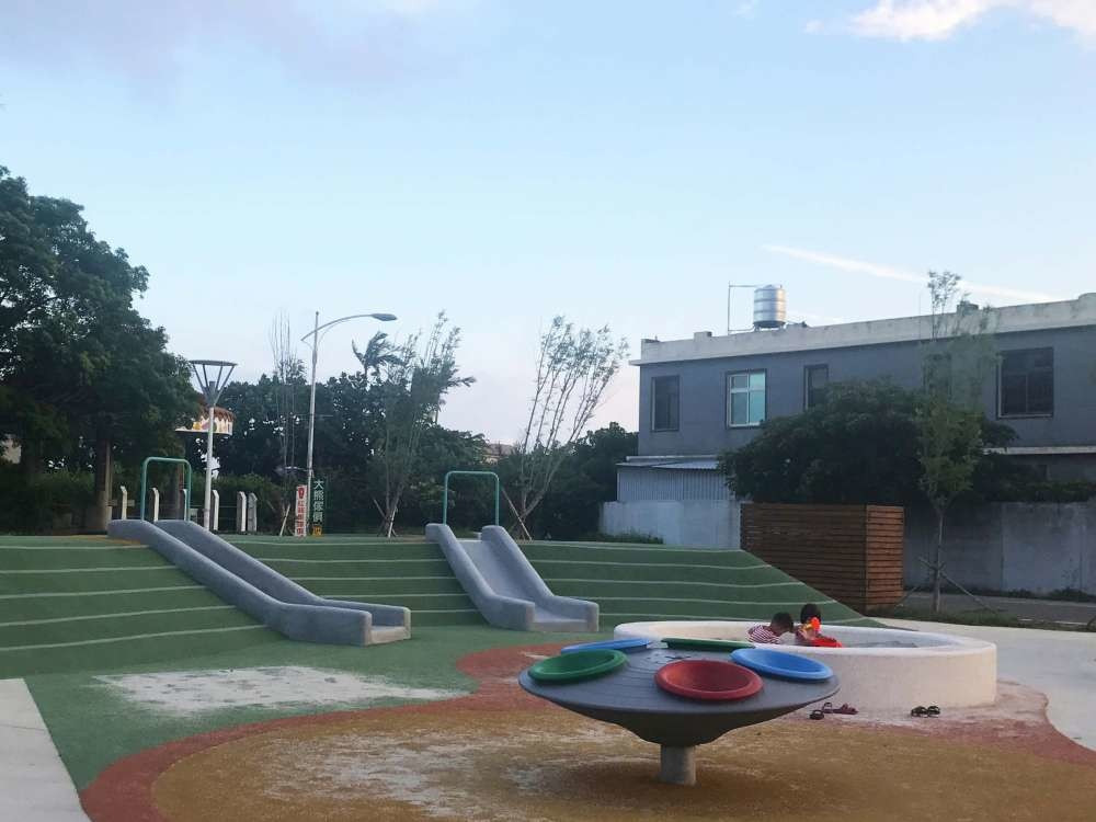 滑梯前方有架高的沙坑與多人旋轉盤,後方還有一般鞦韆與鳥巢鞦韆各1座。架高的沙坑可避免流浪動物跑進去,爸媽可安心讓小朋友玩。