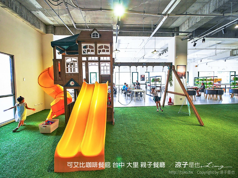 用餐區裝潢是輕爽的輕工業風,加上大片窗戶引入自然光線,營造舒適自然的空間。兒童遊戲區則鋪上人工草皮,寬敞的空間方便小朋友跑跳,還有一座木屋溜滑梯鞦韆,木屋內有廚房組,其他還有積木與跳跳馬等玩具。