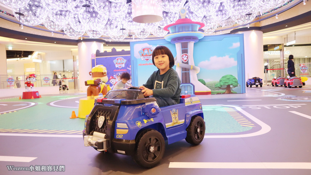 1樓戶外廣場6公尺高巨大的阿奇迎接大家的到來,活動地點位在3樓圓弧區,裡面有拍照佈景、立體公仔、賽車車道與兒童超跑。這裡的超跑是汪汪隊裡的造型車,有阿奇警車、毛毛消防車、小礫工程車,只要憑館內消費發票(消費滿99元以上),就可以預約開車車。
