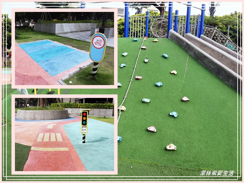 遊戲場分為駕駛訓練場與共融遊具2區,駕駛訓練場鋪設彩色軟墊,利用顏色標示停車區、斑馬線、行進方向等,周邊設有縮小版的紅綠燈、平交道等交通號誌,讓小朋友邊騎車邊認識交通安全。