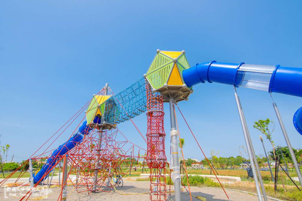 遊戲場採分齡分區設計,分為3-5歲兒童遊戲場、3歲以上綠丘原野樂園、鞦韆遊戲場以及12歲以上的葡藤堡冒險遊戲場。葡藤堡是一座2層樓高的攀爬溜滑梯組,要玩滑梯只能透過立體攀爬架或垂直爬網上去,很具挑戰性,讓大小孩在公園裡也能玩的開心。