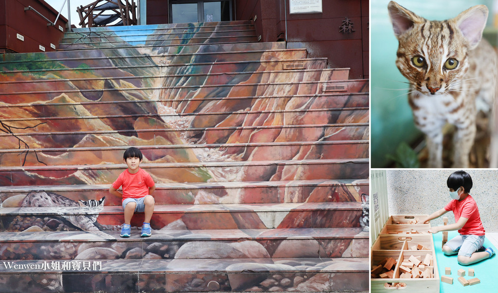 館外階梯有好拍照的3D彩繪階梯,常設展分為認識石虎小檔案與火炎山觀察日記,以圖文方式介紹苗栗生態特色、展示石虎標本,小朋友可以動手玩積木與拼圖。