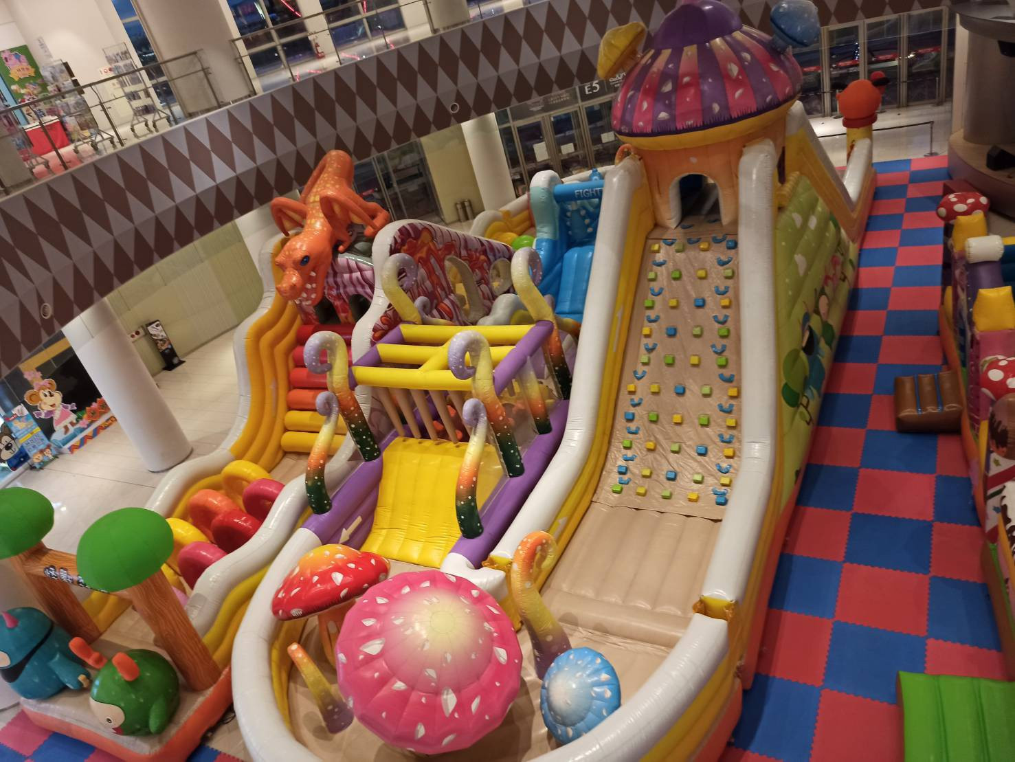 大型怪獸主題氣墊造型充滿童畫風格,色彩繽紛活潑。有可愛的怪獸、磨菇與噴火恐龍等立體氣墊造型。氣墊適合2-12歲小朋友,有攀爬、彈跳、闖關,讓小朋友邊遊玩邊放電。