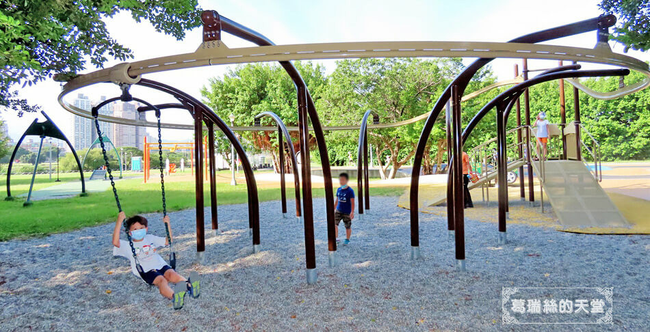 往河堤的方向走,會看到站式與包覆式泰山溜索,公園內共有3座不同造型的滑軌設施,適合各年齡層小朋友遊玩。