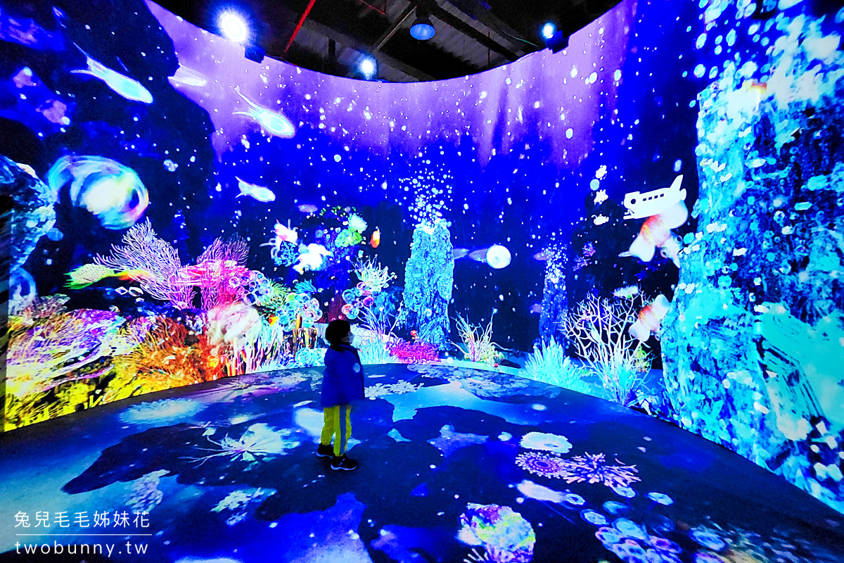 走入展場內,仿佛走入海洋隧道,從地板到牆面,放眼望去都是不停流動的光影。從一開始的繽紛浪花的淺灘區,到海底看著大群沙丁魚在身邊群游、化身七彩光芒,還有感受降至6500公尺深海之美,每個場景如夢似幻,小朋友也大感驚奇。