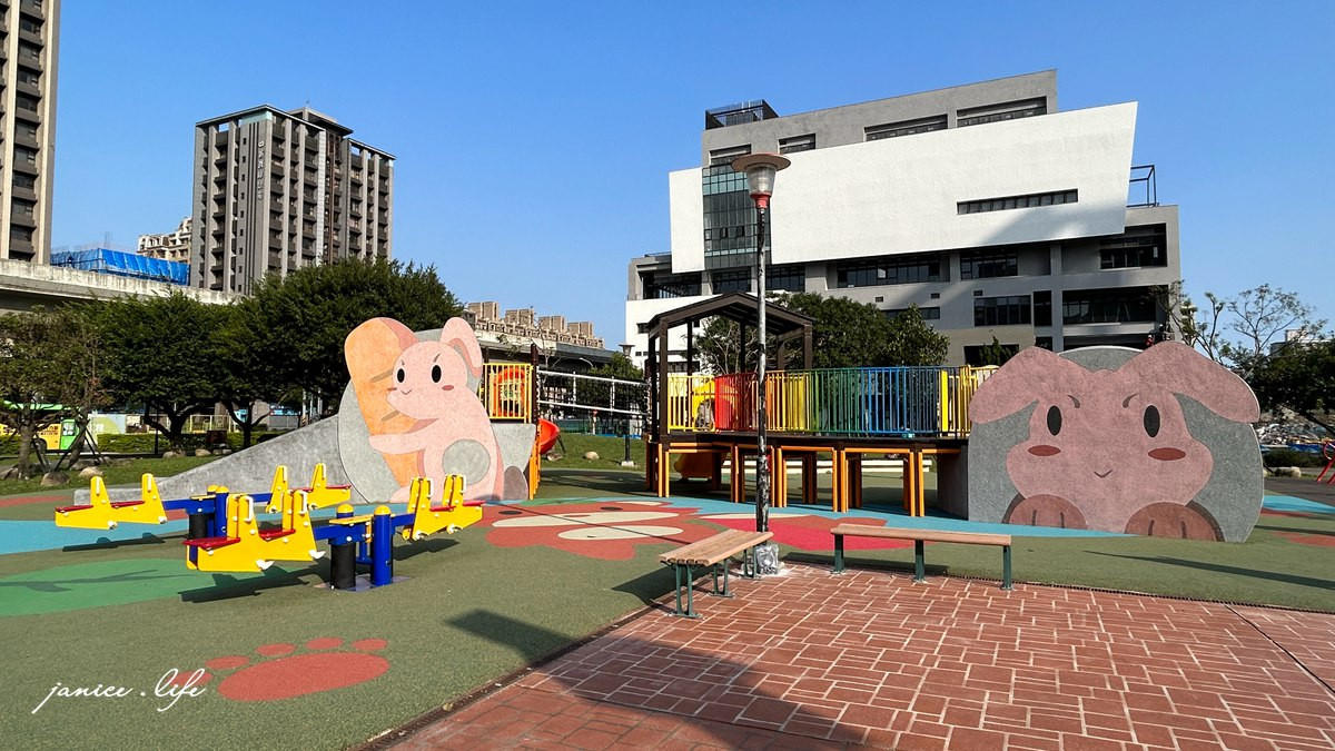 公園遊戲場於2023年2月完成改裝並開放遊玩,全新的遊戲場充滿童趣風格,軟地墊是繽紛可愛的動物圖案,溜滑梯則是以兔兔為主題的複合式遊具,有磨石子溜滑梯、旋轉滑梯、鑽籠、攀岩牆,遊具下方可以讓小朋友穿梭玩躲貓貓。