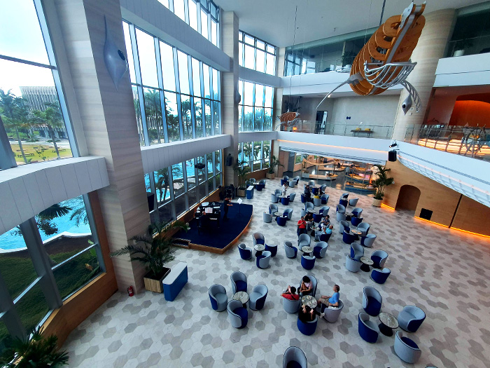 大廳旁則有各式沙發可以休息,前方面向戶外並有大片玻璃帷幕採光明亮,天花板上有10公尺巨型機械鯨魚,仔細看這個械鯨魚還會動哦。