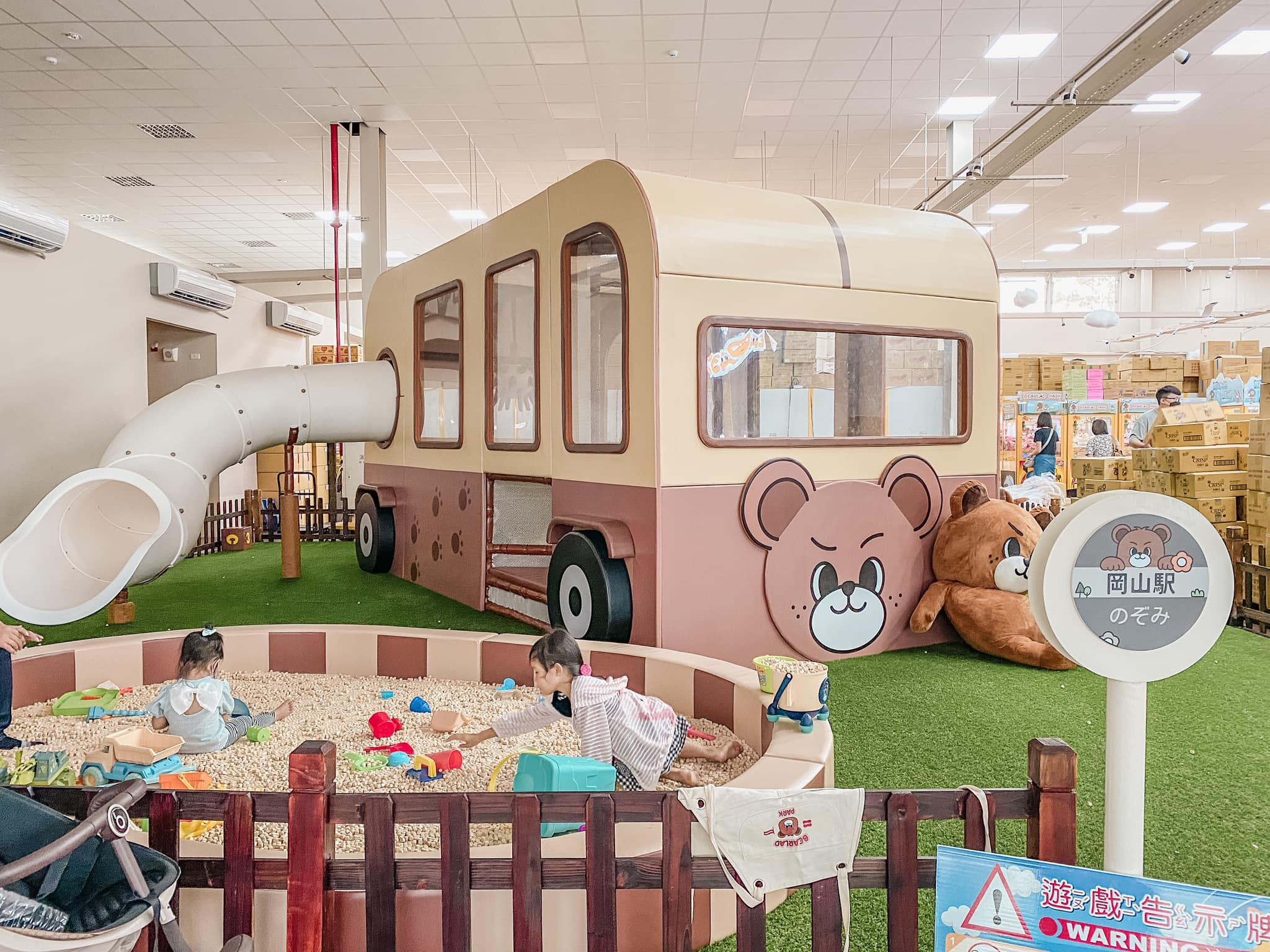 店內裝潢帶點森林野餐風,入口處左手邊擺放不少蛋捲桌與露營椅,並舖上屑木,營造戶外感,最後方還有一座小帳篷。再往前就可以看到可愛的熊熊巴士,車內有編織繩網、獨木橋等設施,並連接水管滑梯;前方有木粒沙坑、挖沙工具,還有幼兒蹺蹺板、不倒翁等遊樂設施。